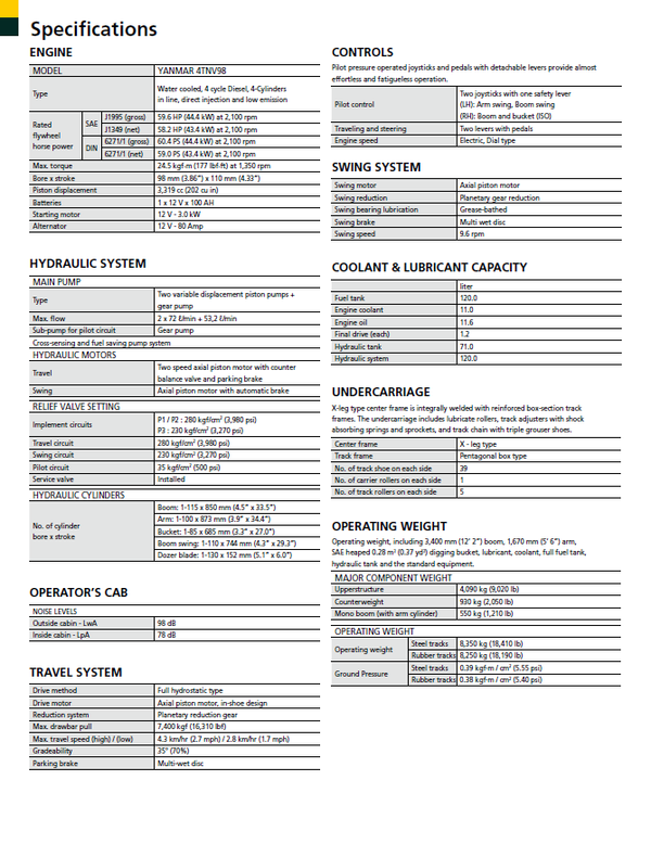 - Engine: Yanmar 4TNV98C, Tier 4 Final-compliant, ensuring optimal fuel efficiency and reduced emissions.